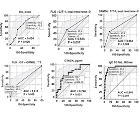 Актуальність. На сьогодні існує невирішене питання персоналізованої діагностики та предикції ризиків розвитку фенотипів атопічних хвороб (АХ) та атопічного маршу (АМ) у дітей. Метою поданого дослідження була розробка інтегральної моделі персоналізовано-прецизійної предикативної генотип-асоційованої діагностики щодо ризику розвитку олігоорганного та поліорганних фенотипів (ООФ, ПОФ) АМ у дітей. Матеріали та методи. У дослідження були залучені 68 дітей віком від 3 до 18 років: 21 — до основної групи; 47 — до контрольної групи. Критеріями включення до основної групи були АХ у комбінаціях атопічного дерматиту (АД), алергічного риніту або ринокон’юнктивіту (АР/АРК) і/або бронхіальної астми (БА): АД+АР/АРК, БА+АР/АРК, АД+АР/АРК+БА. Критерії включення до контрольної групи: функціональна і/або органічна патологія травної системи, відсутність АХ. Усім дітям було зроблено генотипування на варіанти однонуклеотидних варіацій (SNV) rs7927894 гена філагрину (filaggrin — FLG) і rs7216389 гена оросомукоїд-1-подібного білка 3 (orosomucoid-like 3 — ORMDL3) і визначено концентрації в сироватці крові біомаркерів: рутинного загального імуноглобуліну Е (IgE) і новітнього біомаркера-кандидата, кутанного Т-клітинного атрактивного хемокіну (cuteaneous t-cell attracting chemokine — CTACK/CCL27). Результати. Були отримані такі функціональні значення предикторів ризику розвитку ООФ і ПОФ АМ у дітей: вік дитини ≤ 11 років — співвідношення шансів (СШ) з 95% довірчим інтервалом (95% ДІ) становило 3,74 (1,09–12,8), р = 0,025; гетерозиготний генотип С/Т rs7927894 FLG — 2,88 (0,99–8,38), р = 0,051; гомозиготний генотип Т/Т rs7216389 ORMDL3 — 5,19 (1,61–16,8), р = 0,051; комбінація генотипів С/Т rs_7927894 FLG + Т/T rs_7216389 ORMDL3 — 5,87 (1,30–26,42), р = 0,017; концентрація в сироватці крові CTACK/CCL27 ≥ 4308,8 пг/мл — 7,4 (2,35–23,26), р < 0,001; концентрація в сироватці крові загального IgE ≥ 213 МО/мл — 136,7 (15,4–1213,2), р < 0,001. Надалі були отримані діагностичні коефіцієнти (ДК) для моделі персоналізованої предикативної генотип-асоційованої діагностики ризику розвитку ПОФ АМ у дітей (за рангом): 1 — загальний IgE ≥ 213 МО/мл — ДК = +8,7; 2 — CTACK/CCL27 ≥ 4308,8 пг/мл — ДК = +5,0; 3 — Т/T rs_7216389 ORMDL3 — ДК = +5,0; 4 — С/Т rs_7927894 FLG + Т/T rs_7216389 ORMDL3 – ДК = +6,5; 5 — С/Т rs7927894 FLG — ДК = +2,8; 6 — вік ≤ 11 років — ДК = +1,8. Пороговим значенням суми ДК було визначено > 11,8 бала: при значенні 0–6,8 бала ризик розвитку ПОФ АМ у дітей був дуже низьким, при 7,8–9,6 бала — низьким, при 10–11,8 бала — підвищеним, при 12,8–14,6 бала — високим і при ≥ 15,5 бала — дуже високим. Висновки. Для персоналізовано-прецизійної предикції ризику розвитку олігоорганних і/або поліорганних фенотипів АМ у дітей пропонується застосування генотип-асоційованої інтегральної моделі, яка включає широкий спектр факторів-предикторів, як-от: загальнобіологічний — вік дітей до 11 років; генетичні — генотипи С/Т rs7927894 FLG, Т/Т rs7216389 ORMDL3; біохімічні — рівні сироваткових концентрацій загального IgE ≥ 213 МО/мл і CTACK/CCL27 ≥ 4308,8 пг/мл. Пороговим значенням підвищеного ризику розвитку даних фенотипів у дітей є сума ДК > 11,8 бала.
