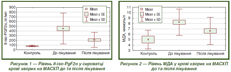 Аналіз отриманих даних показав, що до початку лікування комплексним засобом Гепавіста Детокс середній рівень 8-iso-PgF2α становив (454,3 ± 48,0) пг/мл, що значно перевищувало показники контрольної групи (рис. 1).