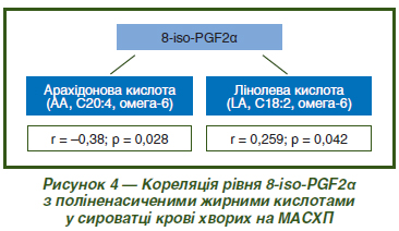 З метою поглибленого вивчення взаємозв’язку між інтенсивністю оксидативного стресу та рівнями окремих фракцій ПНЖК у пацієнтів із МАСХП було проведено кореляційний аналіз із розрахунком коефіцієнтів рангової кореляції Спірмена. Встановлено, що найбільш виражений статистично вірогідний зворотний зв’язок спостерігався між рівнем арахідонової кислоти (AA, C20:4, омега-6) та вмістом 8-iso-PGF2α у сироватці крові (r = –0,38; p = 0,028). Це може свідчити про зниження рівня субстрату (AA) на тлі його активного неферментативного перетворення на 8-iso-PGF2α за умов посиленого оксидативного стресу. Така взаємодія відповідає відомим механізмам неензиматичного циклопероксидування омега-6 ПНЖК у патогенезі МАСХП.