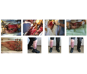 Дистракційний метод КФ дозволяв здійснити заміщення інфікованого дефекту великогомілкової кістки, м’яких тканин шляхом механічного зменшення розміру дефекту і поліпшення судинного кровопостачання. Комплексна терапія (мультимодальне періопераційне знеболювання із застосуванням Дексалгіну®, інфулгану, перидуральної анестезії маркаїном, антибактеріальна терапія, етапний дебридмент, ВАК-терапія, напівжорсткі пов’язки) дозволила досягти непоганих результатів. Наводимо приклад клінічного випадку (рис. 3).